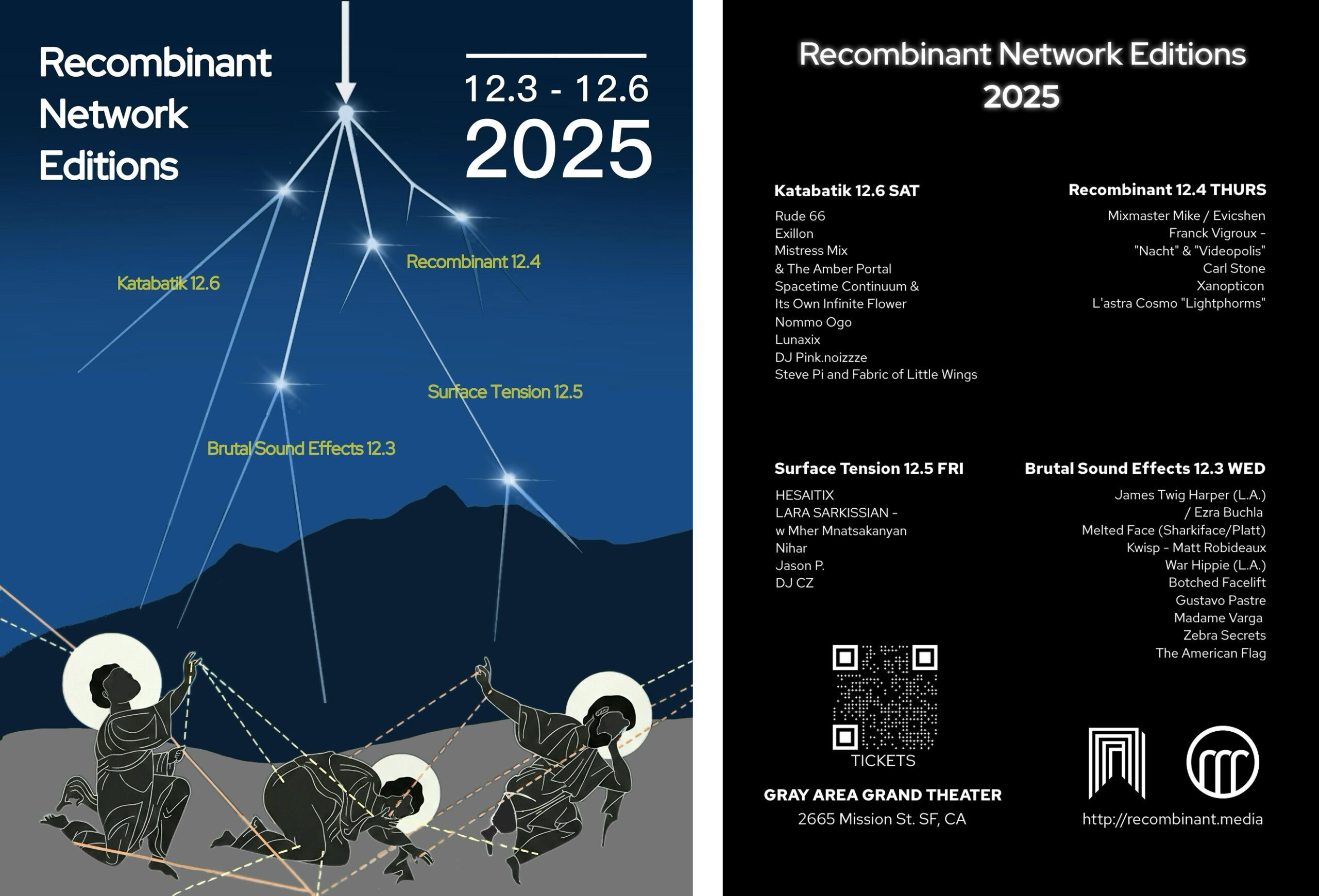 Once and future experimental club night Surface Tension reawakens, following a period of dormancy, to curate an evening of unheimlich electronics in San Francisco as part of Recombinant Festival 2025.
