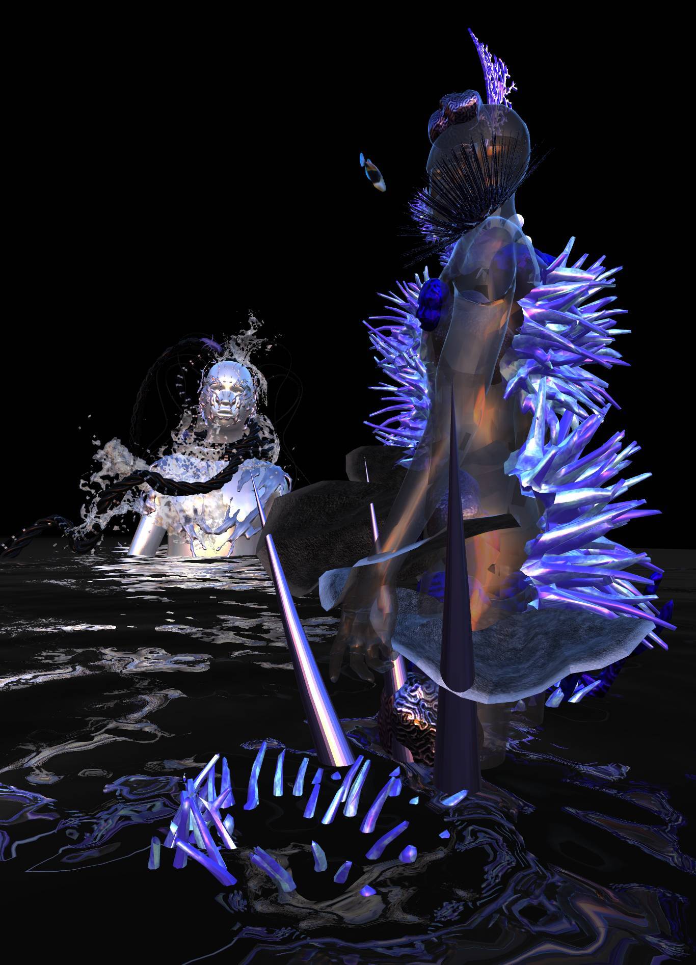 Eclipsatrix Exuvia (2021) is a virtual performance that takes place in a virtual amphitheater, built in a custom environment created by the artist and framed by various sculptural objects. Wearing a motion capture suit, all her dance movements are screened and streamed. The audience is invited to wander and freely explore the online environment and its elements, and then the artist appears "as an avatar adorned in stylized armor" rhyming:Unveiled biennale, holy grail eclipse golly exalted derailed leaderships post folly prevailing sailing space ships hailing from Cali inhale post-Pokalypse (...)