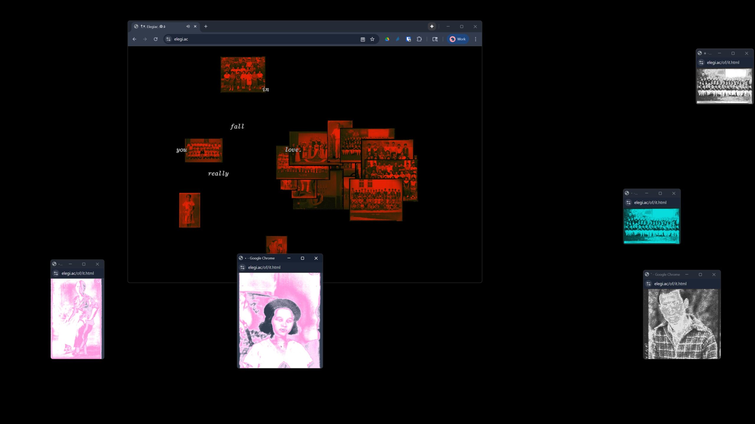 In Chia Amisola's Elegiac, hundreds of browser windows unfold on the desktop, weaving a narrative around cultural myths of creation and destruction with the internet's cycles of collapse and repair. Entirely composed from media, sound, and text sourced from the Internet Archive, the generative work presents an ever-changing hypertextual myth out of the stories the internet chooses to tell itself. Throughout their practice, Amisola's sites represent acts of self-preservation in a medium always at risk of disappearance, attempting to make sense of intimate histories and selves amidst what has been collectively preserved and lost.