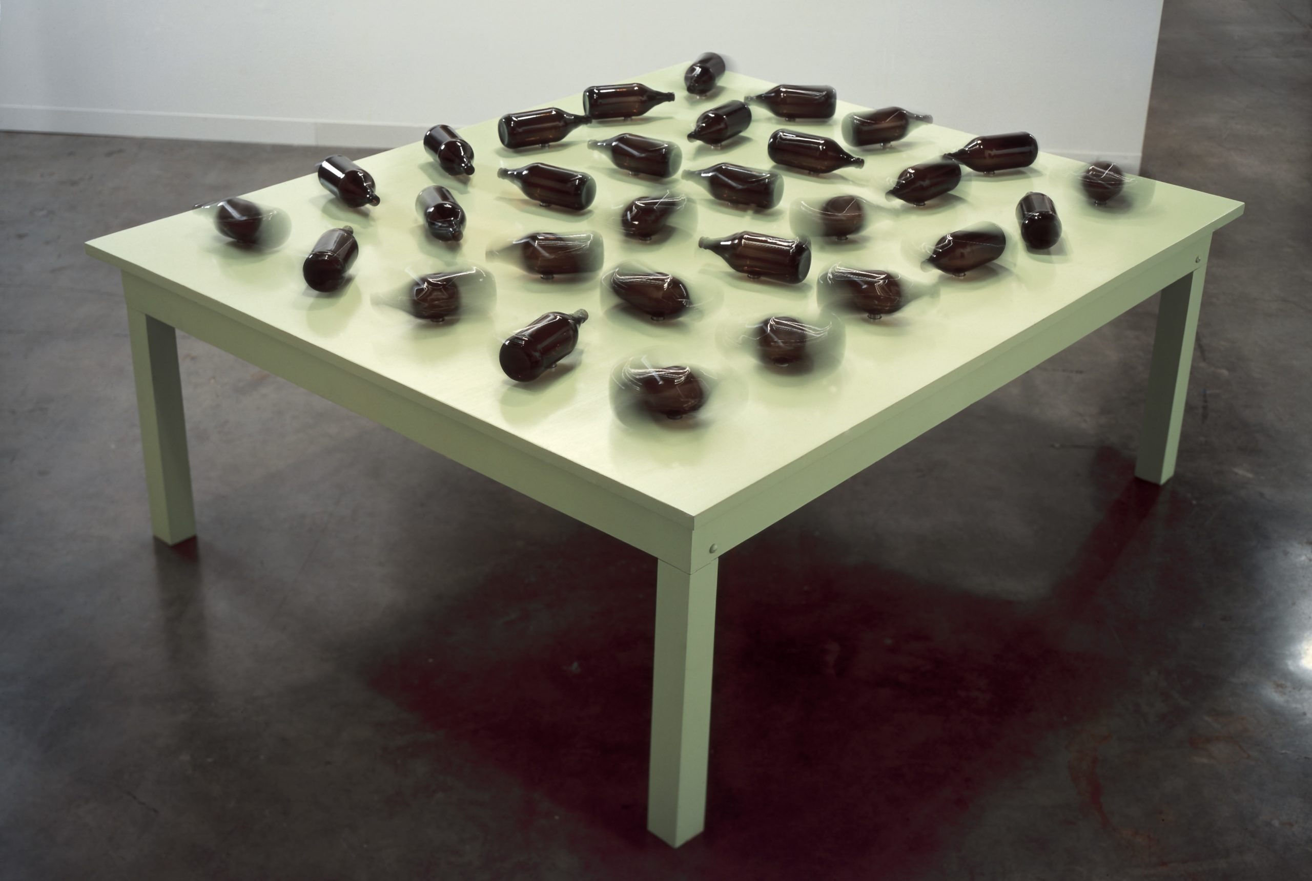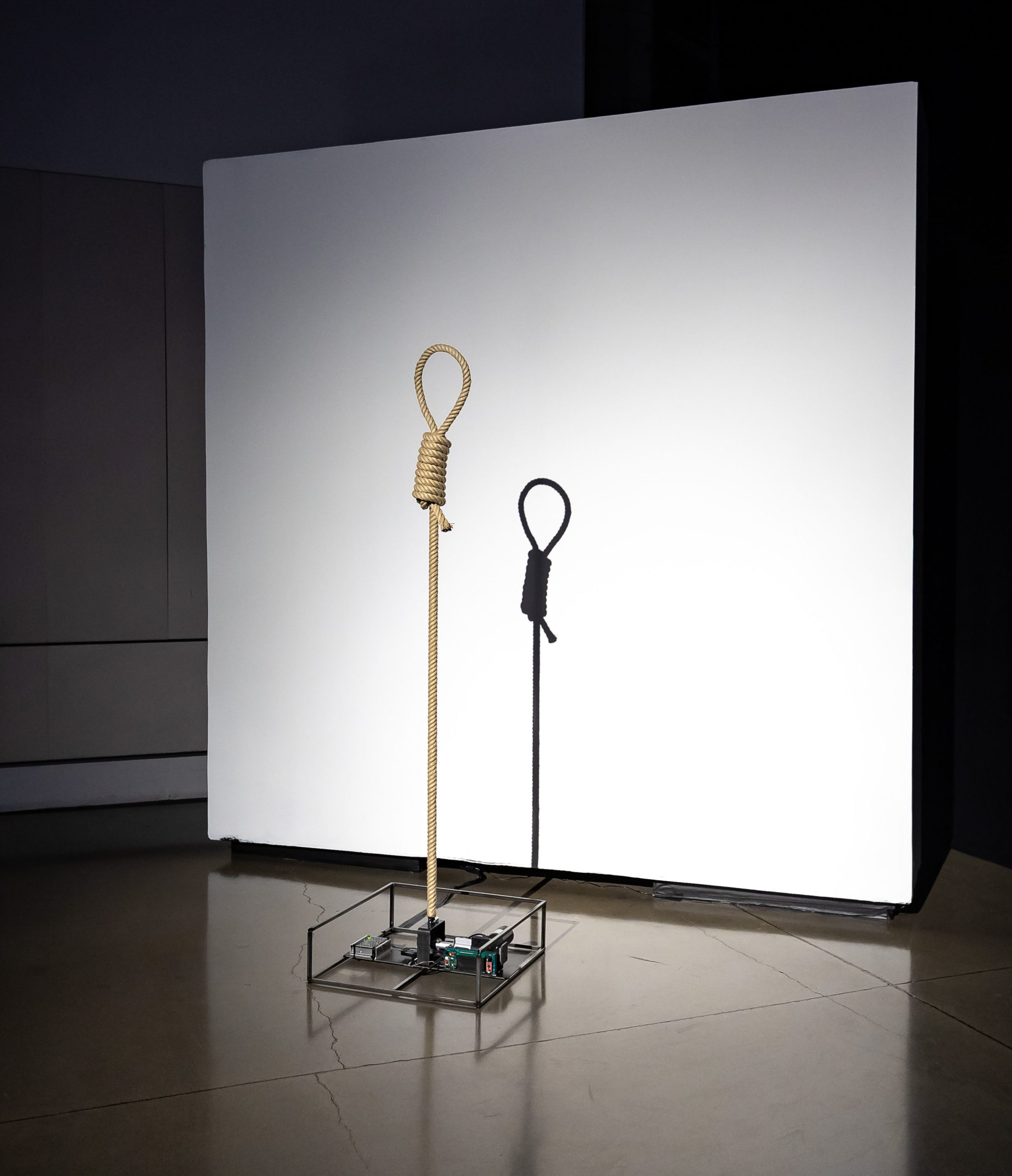 The show also includes kinetic sculptures that animate common-place objects. “Synaptic Caguamas” (2004) is an array of “Caguama”-sized beer bottles that spin on a Mexican “cantina” bar table, following patterns generated by cellular automata that simulate the neuronal connections of the brain. “Sway” (2016) is a noose that stands mysteriously inverted and that gently sways every time ICE arrests a person, like a metronome.