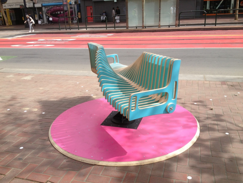 Bench Go Round is just what it sounds like, a cross between a park bench and a merry-go-round. Friends or strangers can spin gently or energetically, cooperating in a simple, fun, no-stress interaction that hearkens back to childhood and everyone’s favorite playground game. The bench is also a lovely sculptural form, rewarding the eye when empty, with fluctuating colors that give an iridescent impression when the bench spins.