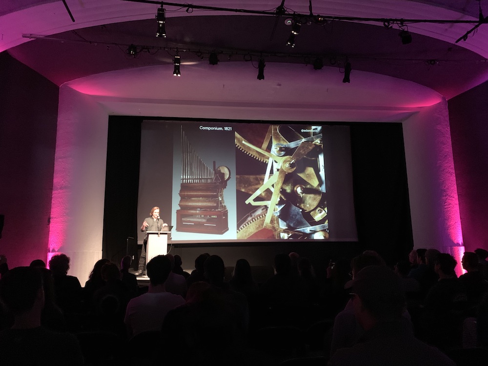 He was followed by Wobbly (Jon Leidecker), who had a slew of gear spread across the table – quite a pile, to be honest: three or more iPads, a device that appeared to be some kind of MIDI playback device, a multisampler keyboard, and numerous other gadgets. Wobbly was busy to say the least, with several of the devices in combinations cross-talking with one another as the sounds transitioned from abrasive density to sparse noise and back again. Wobbly’s performance stood in perfect contrast to Charlie’s set; we were clearly in for as diverse a set of performances and we’d seen panel talks earlier in the day.