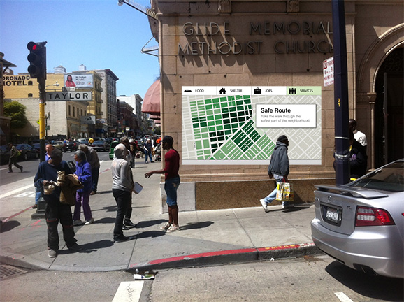 The Word On The Street project delivers vital information to those seeking assistance in the Mid-Market neighborhood of San Francisco, CA. This information is communicated through a large, street-level digital screen showing a live stream of up-to-date service offerings from local organizations. In particular this information includes time and location details for: present availability of beds and housing, upcoming meals, job opportunities, health services, counseling and education.